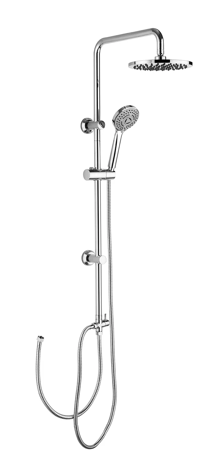 Цельная стойка (нерж. сталь, хром): высота 1000мм , диаметр 22мм ,вылет верхнего душа 357мм ,держатель лейки плавающий FightFix , подвижные крепления FreeMount Лейка верхнего душа(ABS-пластик,хром) : на подвижном шарнире, диаметр 200мм, Форсунки Self-Clean Device Ручная лейка: диаметр 105мм, 3 режима, Форсунки Self-Clean Device Переключатель с ручного на верхний душ: керамика, в латунном корпусе Комплектация: душевой шланг 150см и шланг для подкл. к смесителю (в метал. оплетке) , монтажный комплект